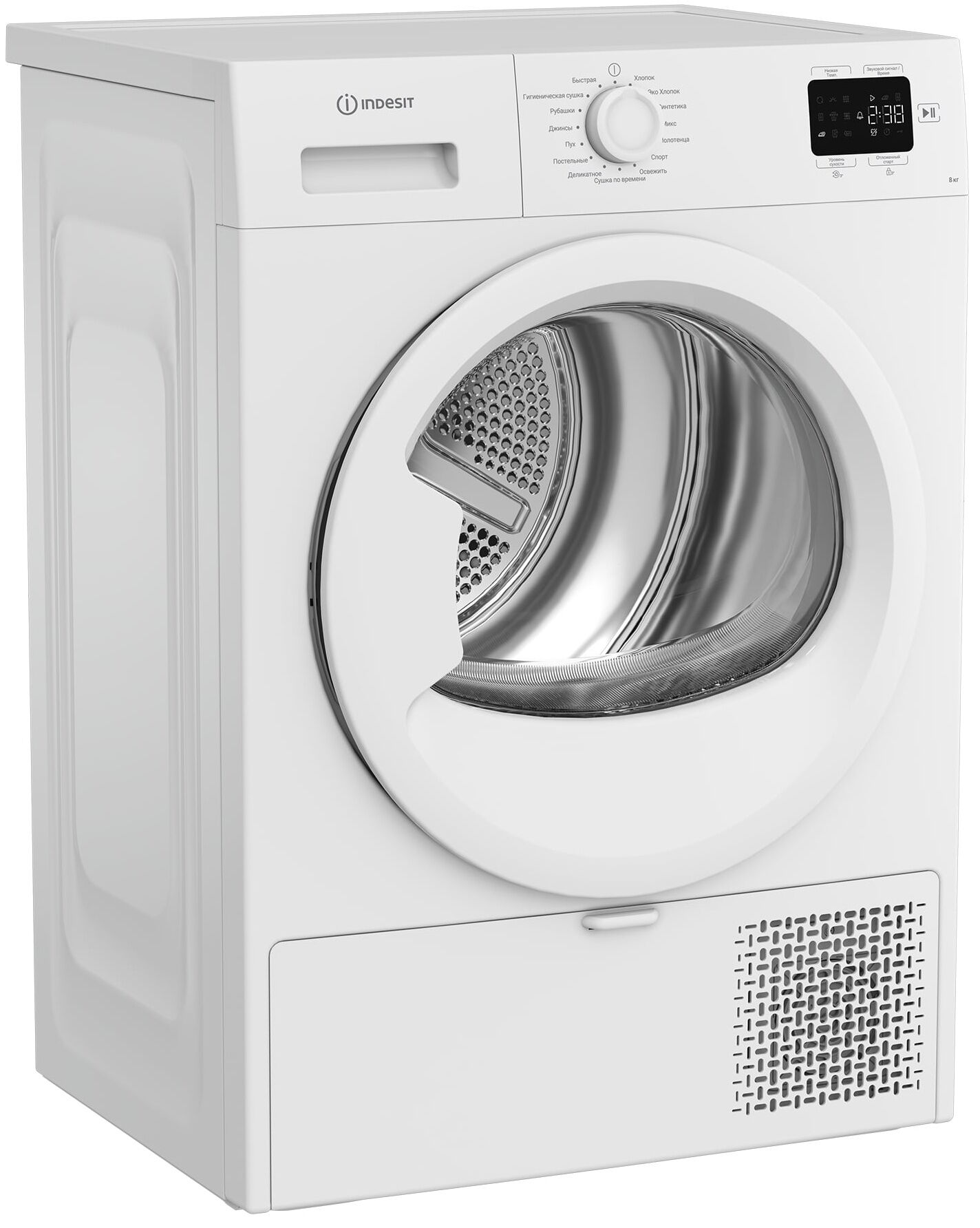 - Вместительная загрузка 8 кг – идеально для больших семей, позволяет сушить за один цикл постельное бельё, полотенца и объёмные вещи.