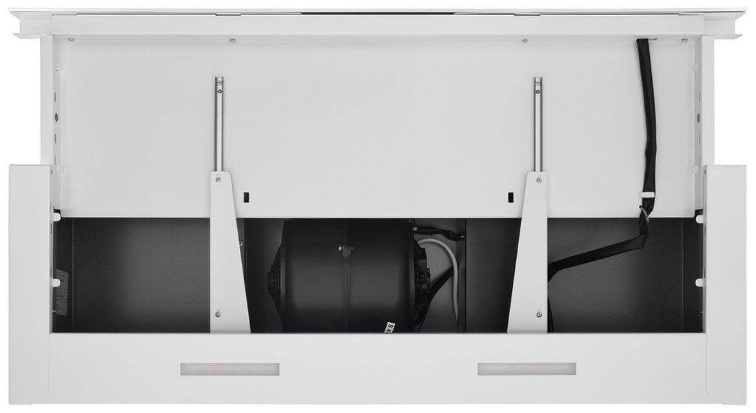 - Бесшовная эстетика – в сложенном состоянии вытяжка становится невидимой частью гарнитура, не нарушая дизайн. Белое стекло гармонирует со светлой мебелью.