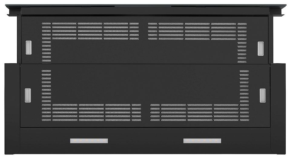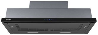 - Элегантная скрытность – в сложенном состоянии вытяжка становится невидимой, не нарушая гармонию кухонного интерьера. Черное стекло добавляет стильный акцент.