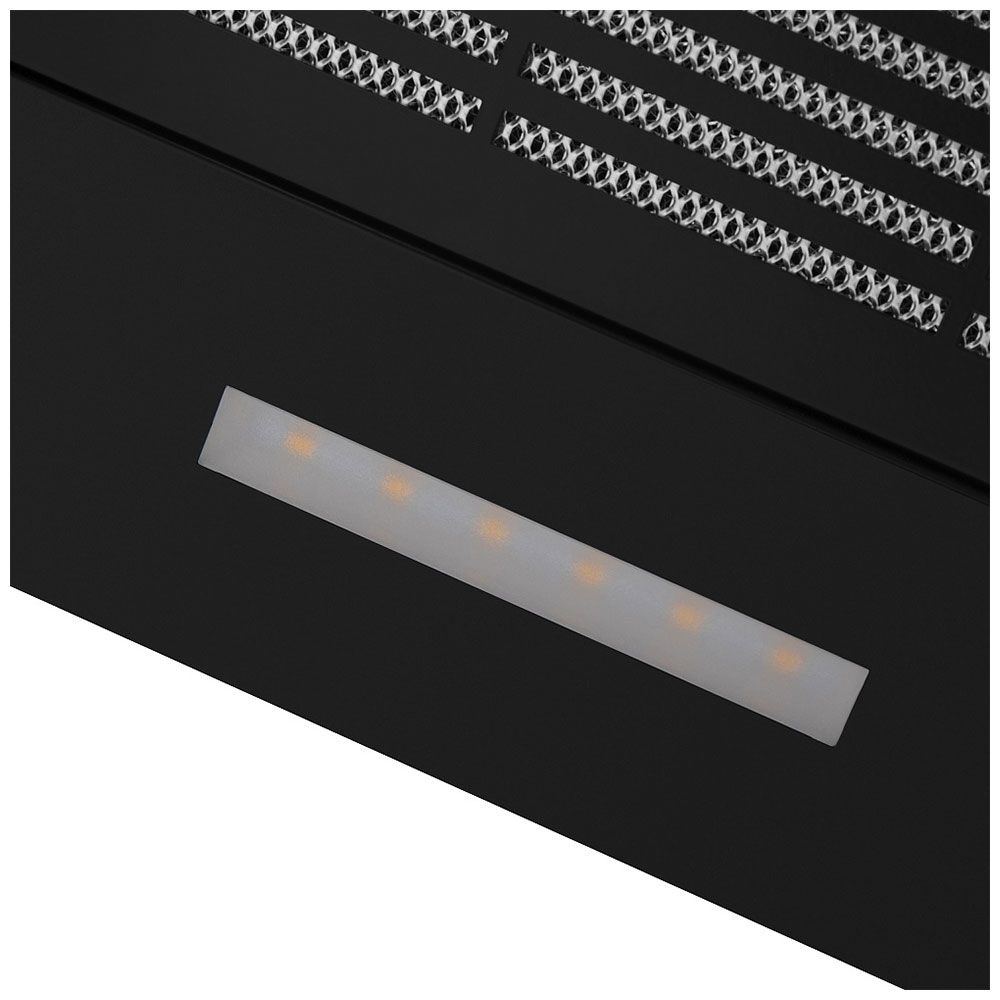 - Полная интеграция и стильный дизайн – в нерабочем состоянии вытяжка полностью скрыта в шкафу, сохраняя безупречный вид кухни. На виду остается только стильная черная стеклянная панель.