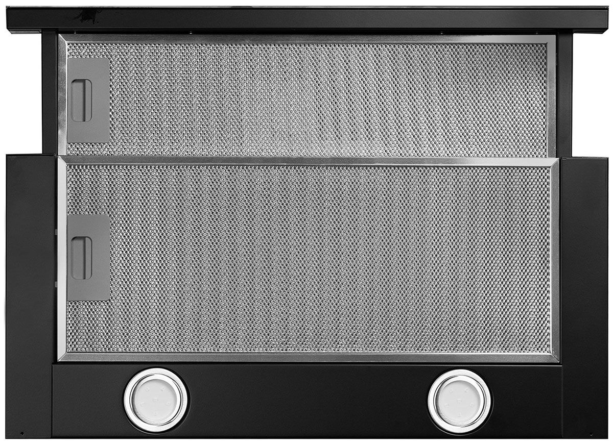 Телескопическая выдвижная панель из черного стекла — в закрытом состоянии вытяжка полностью скрыта в шкафу. Глянцевая черная панель выдвигается, значительно увеличивая зону всасывания и повышая эффективность работы.