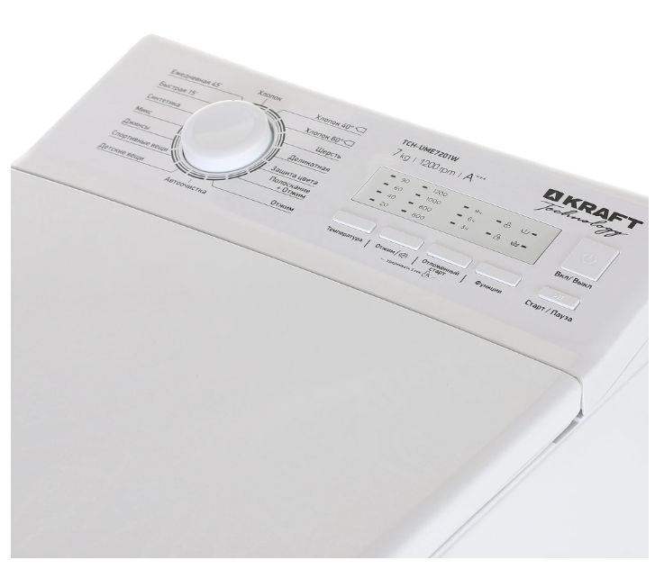 Вертикальная стиральная машина Kraft TCH-UME7201W — загрузка 7 кг с высокой скоростью отжима 1200 об/мин и гарантией 2 года