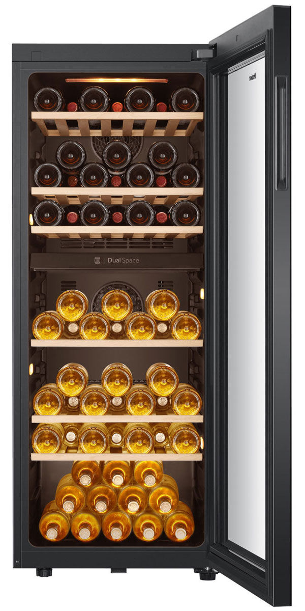 - Две независимые температурные зоны (Dual Space) – раздельное хранение вин с разными требованиями: от +5°C до +20°C. Верхняя зона идеально подходит для белых и игристых вин (5-12°C), нижняя – для красных (13-20°C). При необходимости зоны можно объединить в одну для единого режима.