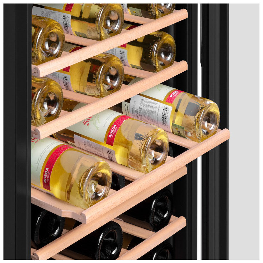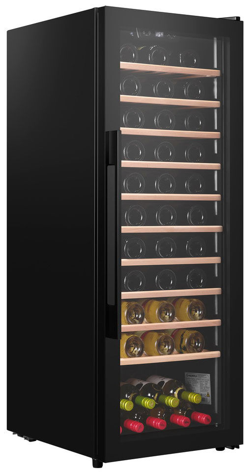 - Огромная вместимость при стандартной ширине – полезный объём 201 литр и 10 деревянных полок из бука позволяют систематизировать и хранить до 84 стандартных бутылок. Это решение для сформированной коллекции или коммерческого запаса при ширине всего 48 см.
