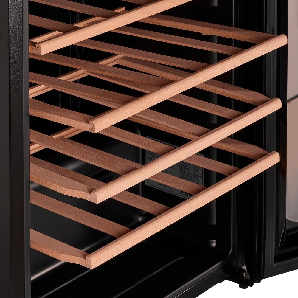 Натуральные деревянные полки – 6 прочных полок из массива бука надежно и безопасно хранят до 34 стандартных бутылок, минимизируя вибрацию и шум.