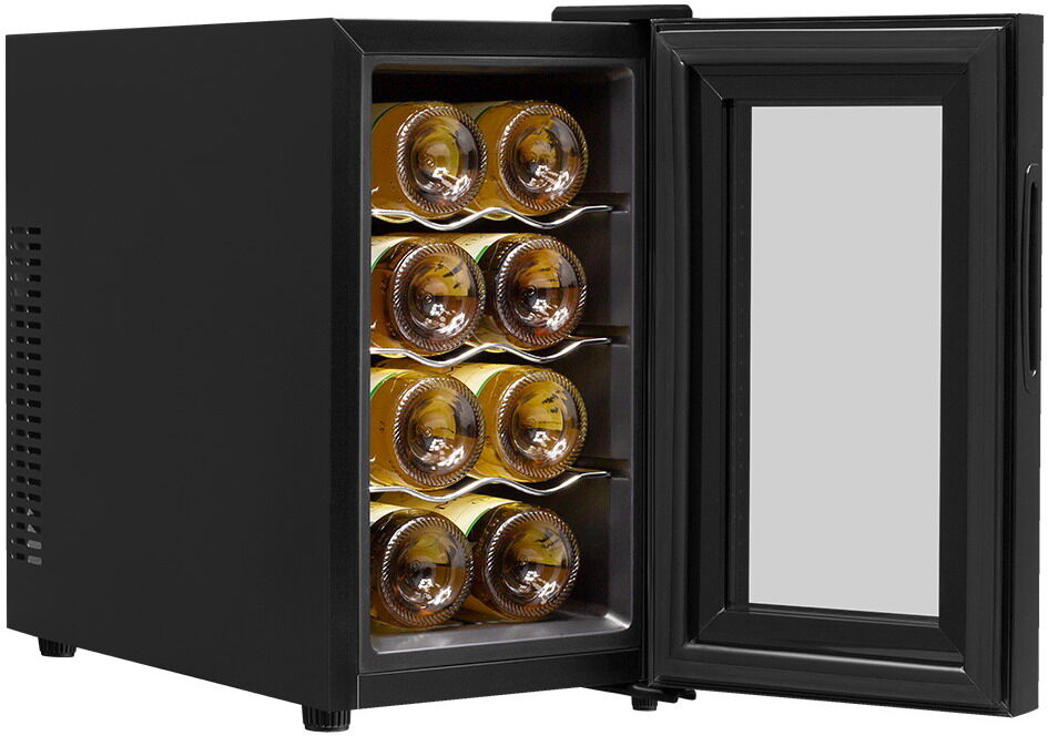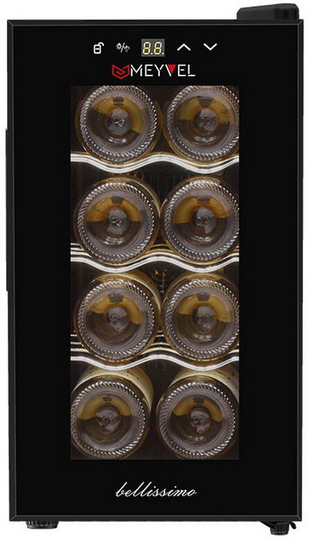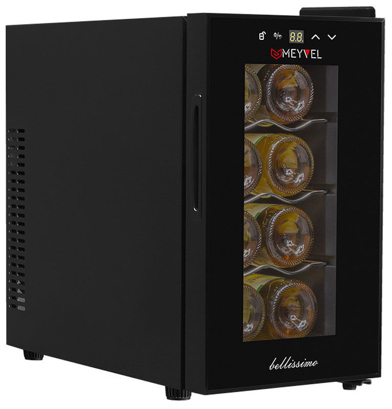 Винный шкаф Meyvel MV08-TB1 – компактный термоэлектрический шкаф с демонстрационным режимом подсветки на 8 бутылок