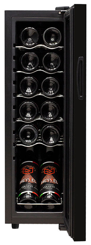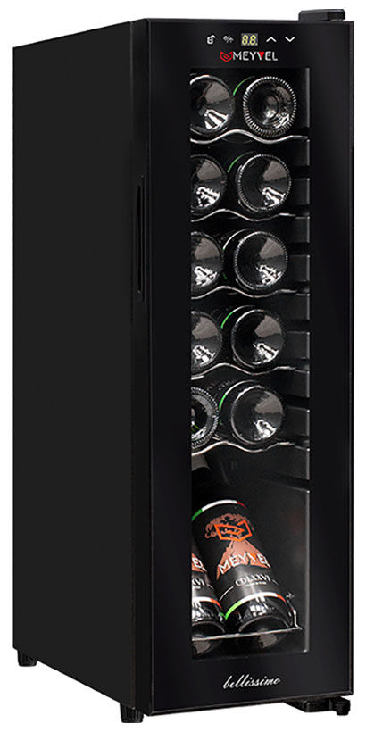 Винный шкаф Meyvel MV12-CBD1 – узкий компрессорный шкаф на 12 бутылок с демонстрационной полкой и энергоэффективностью класса А