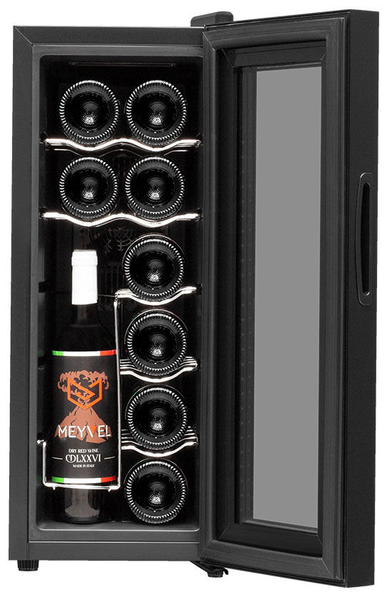 Винный шкаф Meyvel MV12-TBD1 – это компактный термоэлектрический шкаф, который решает задачу хранения 12 бутылок в узком пространстве (ширина 25,2 см) с уникальной возможностью вертикального размещения бутылок на одной из полок. Модель сочетает энергоэффективность, тихую работу и функцию постоянной подсветки.