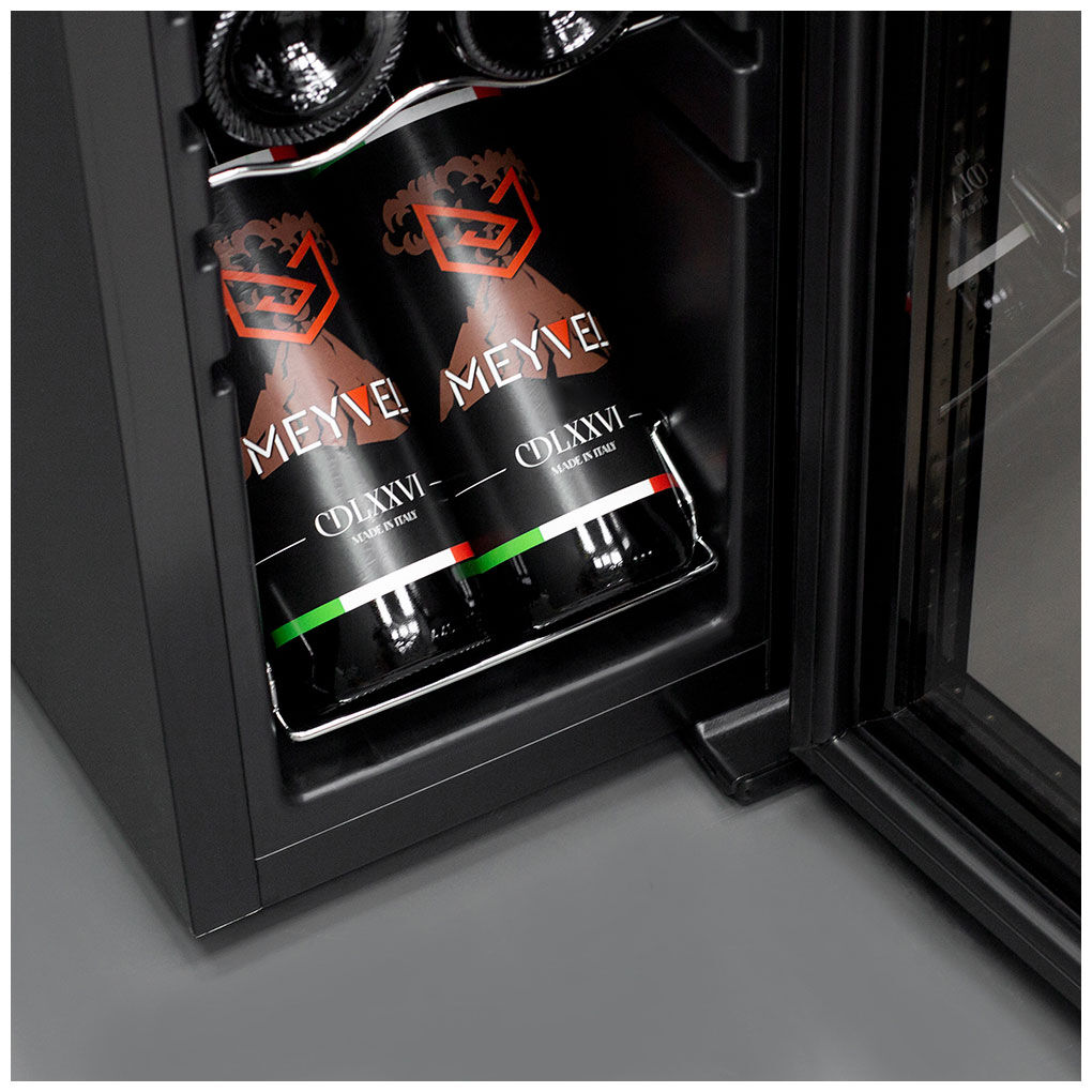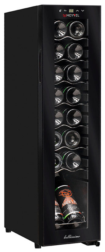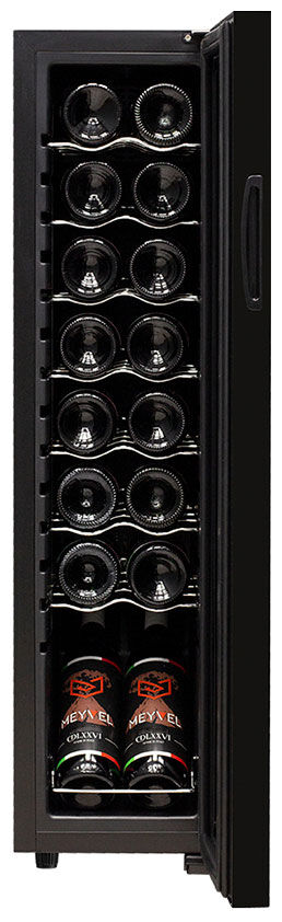 Винный шкаф Meyvel MV16-CBD1 – узкий высокий шкаф на 16 бутылок с демонстрационной полкой и хромированными полками
