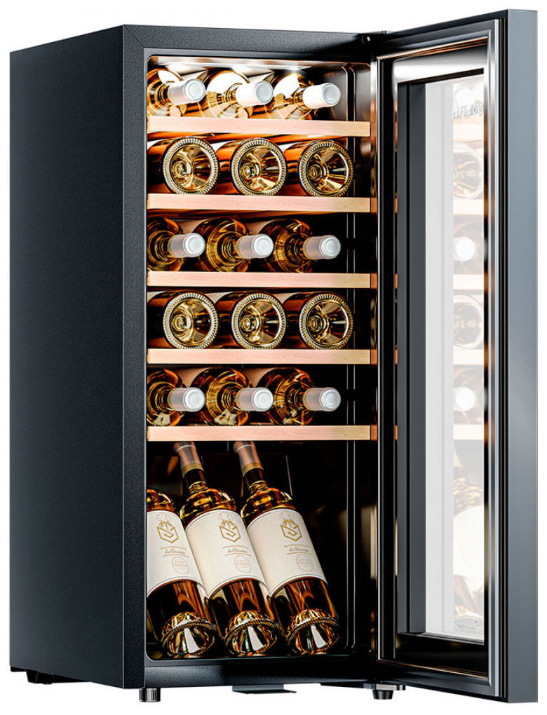 - Тихая статическая система охлаждения – использование естественной конвекции (статическое охлаждение) вместо вентиляторов гарантирует исключительно низкий уровень шума (38 дБ) и полное отсутствие вибраций, создавая идеально спокойные условия для созревания вина.