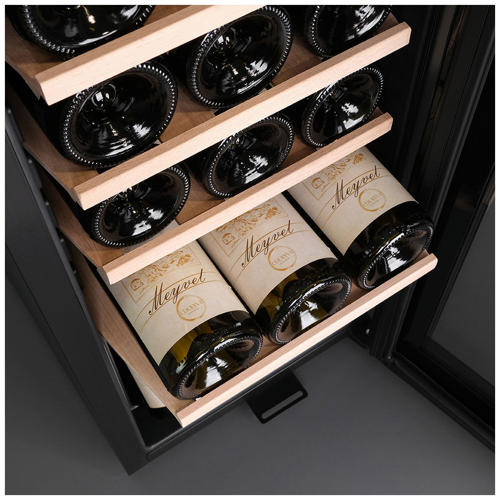 - Оптимальная организация с демонстрационной полкой – 5 полок из чёрного массива бука включают специальную демонстрационную полку для эффектной презентации выбранной бутылки. Полки выдвижные, также предусмотрена возможность установки бутылок в вертикальное положение.
