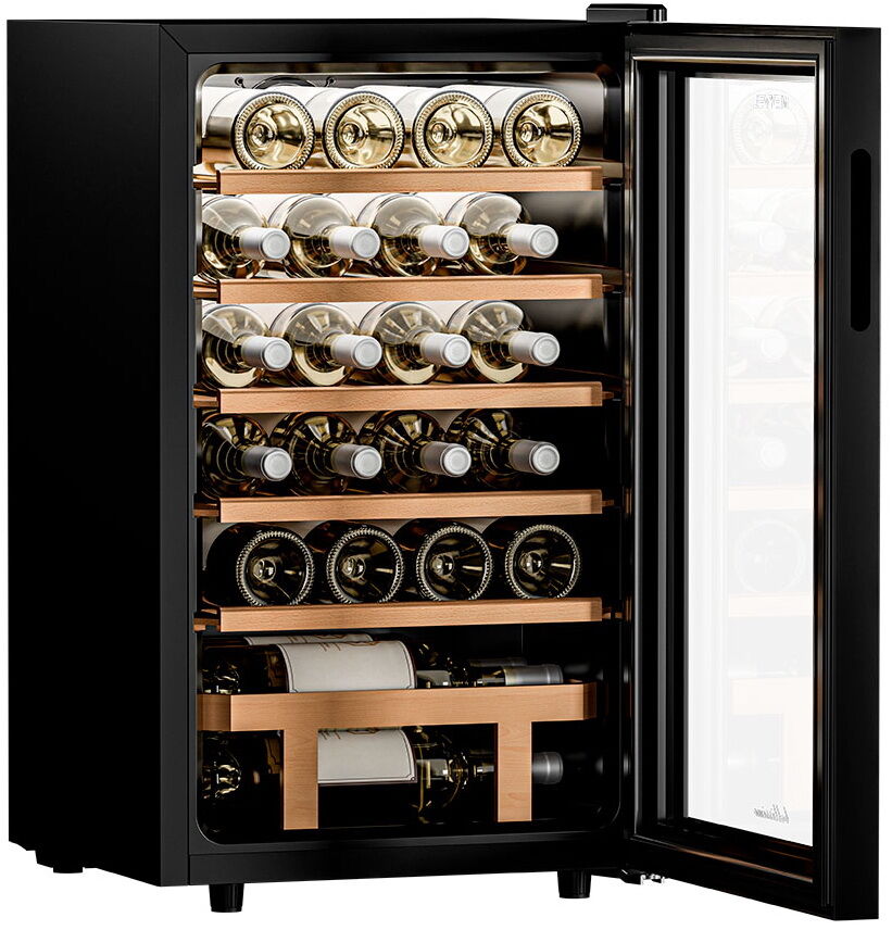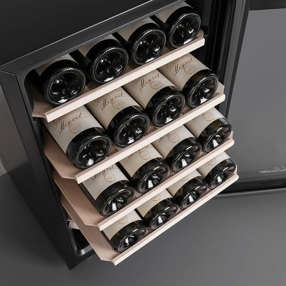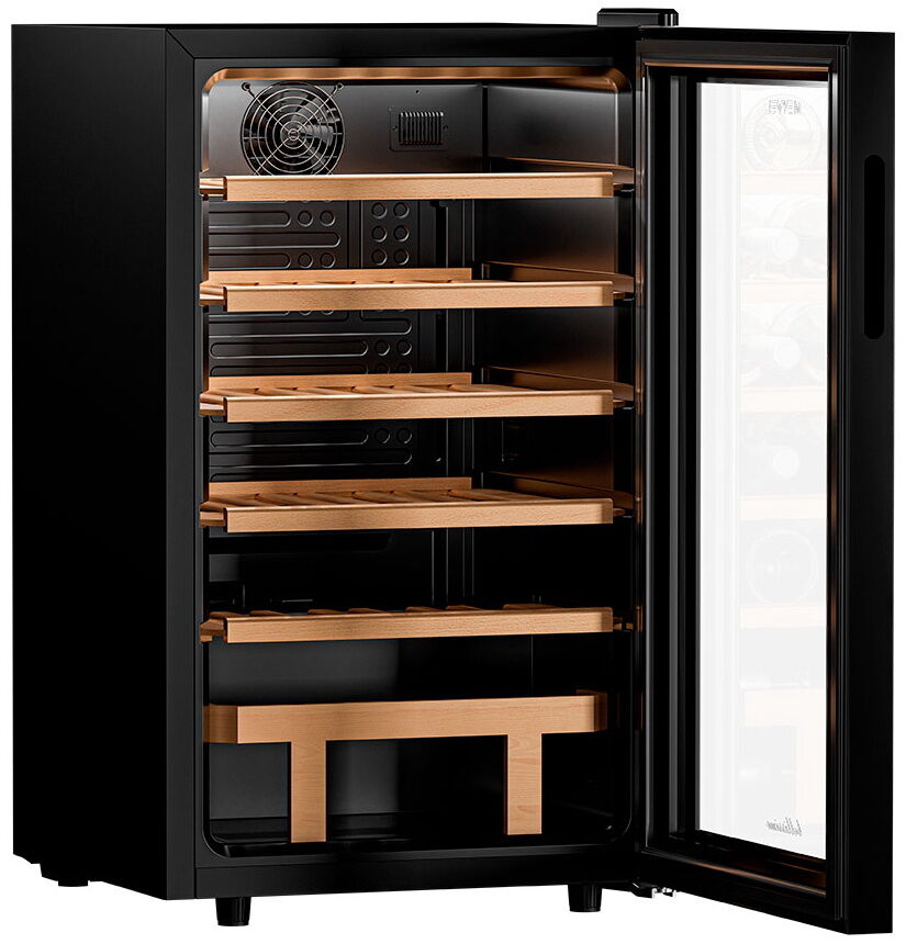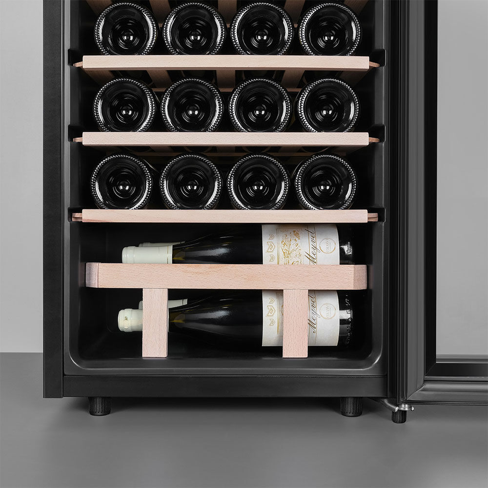 - Удобная организация на деревянных полках – 5 выдвижных полок из массива бука, включая специальную полку для нестандартных бутылок (например, для шампанского), обеспечивают лёгкий доступ и возможность размещения бутылок как горизонтально, так и вертикально (для открытых напитков).