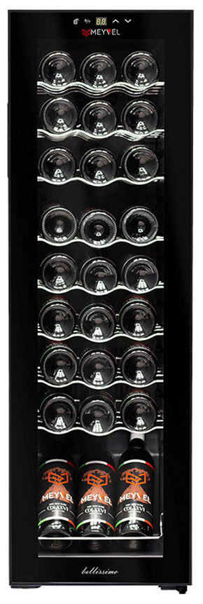 Винный шкаф Meyvel MV27-CBD1 – это высокий и вместительный компрессорный шкаф, эффективно использующий вертикальное пространство для хранения коллекции до 27 бутылок. Модель с 9 металлическими полками, включая демонстрационную, и сенсорным управлением сочетает вместительность, энергоэффективность и функцию презентации отдельных экземпляров коллекции.
