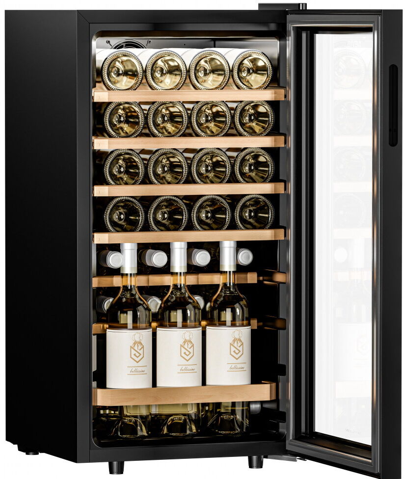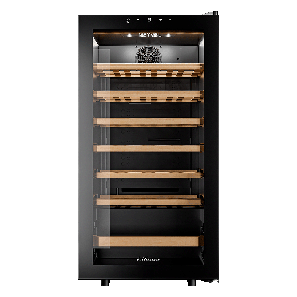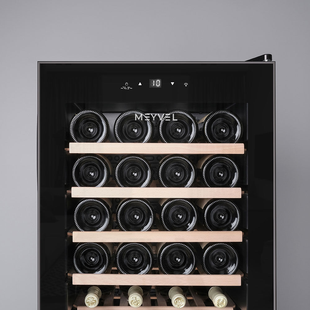 Винный шкаф Meyvel MV28-KBF1 – вместительный компрессорный шкаф на 28 бутылок с полкой для шампанского и вертикальным хранением