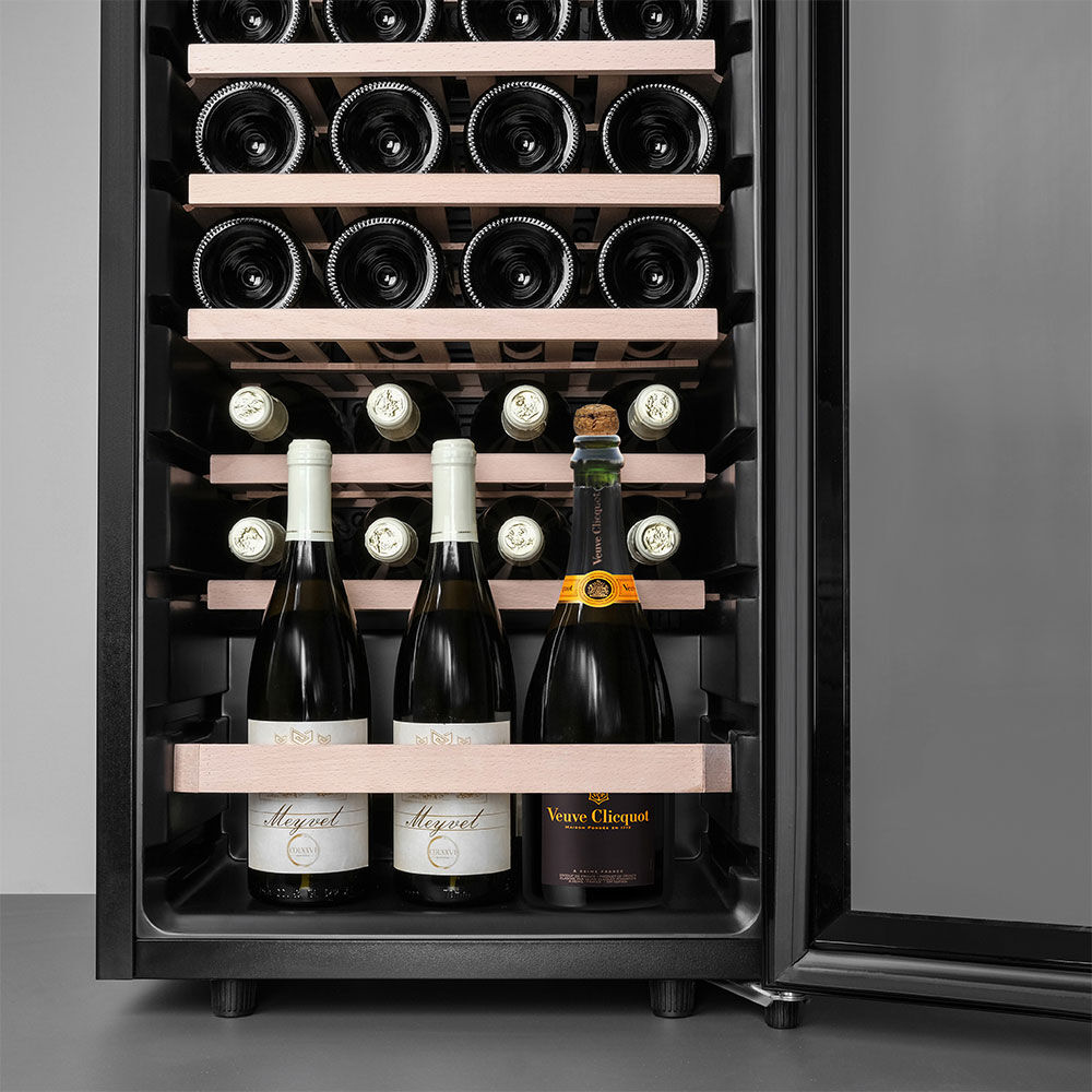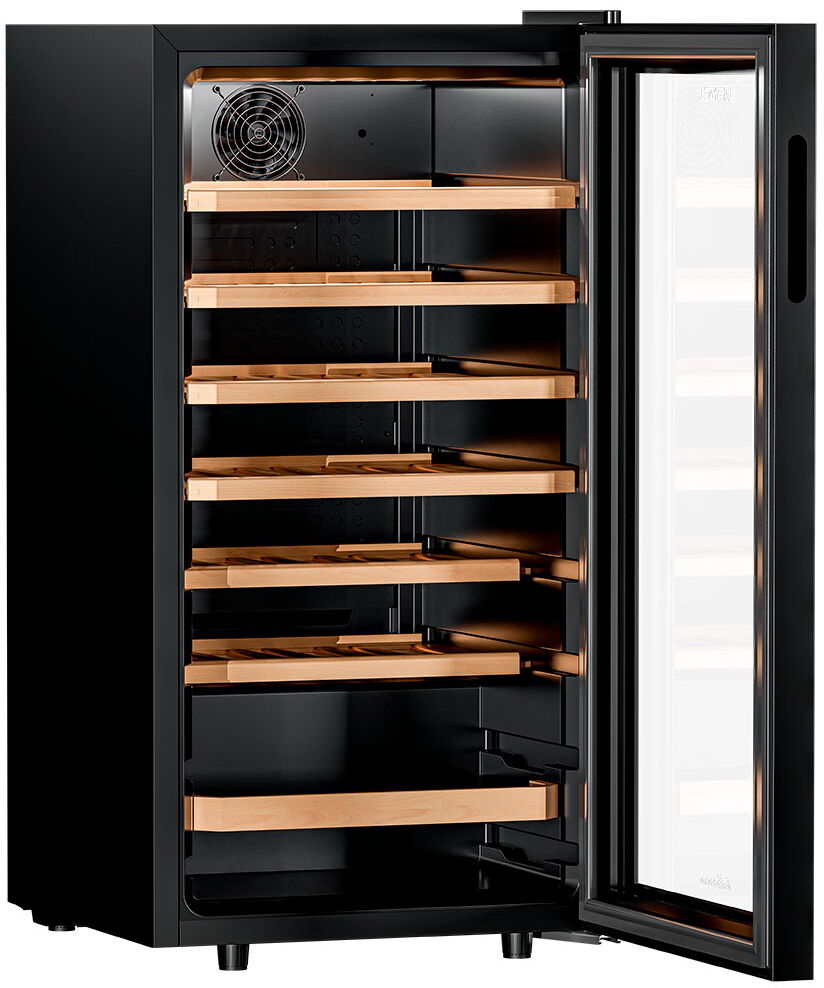 - Универсальная организация хранения – 6 выдвижных полок из массива бука включают специальную полку для нестандартных бутылок (шампанское, магнумы). Дополнительно предусмотрена возможность установки бутылок в вертикальном положении, что удобно для краткосрочного хранения открытых вин.