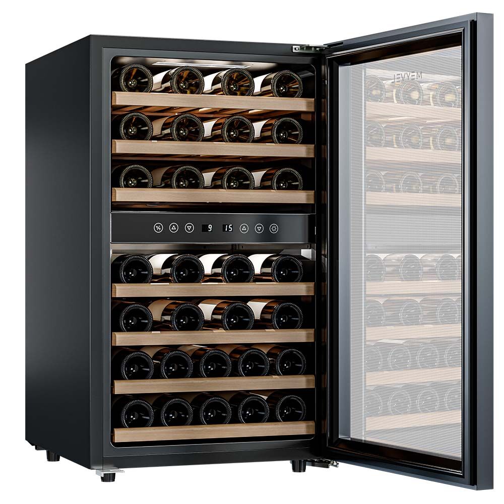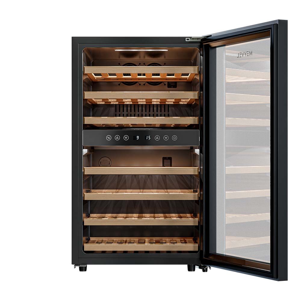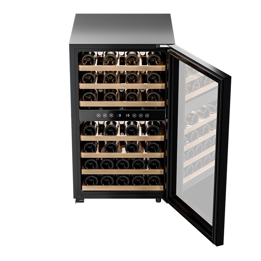 - Двухзонный климат-контроль с равномерным охлаждением – две температурные зоны с общим диапазоном от +5°C до +18°C позволяют гибко настраивать условия для разных типов вин. Динамическая система охлаждения с качественной циркуляцией воздуха обеспечивает равномерную температуру и поддерживает оптимальную влажность 60-80%.
