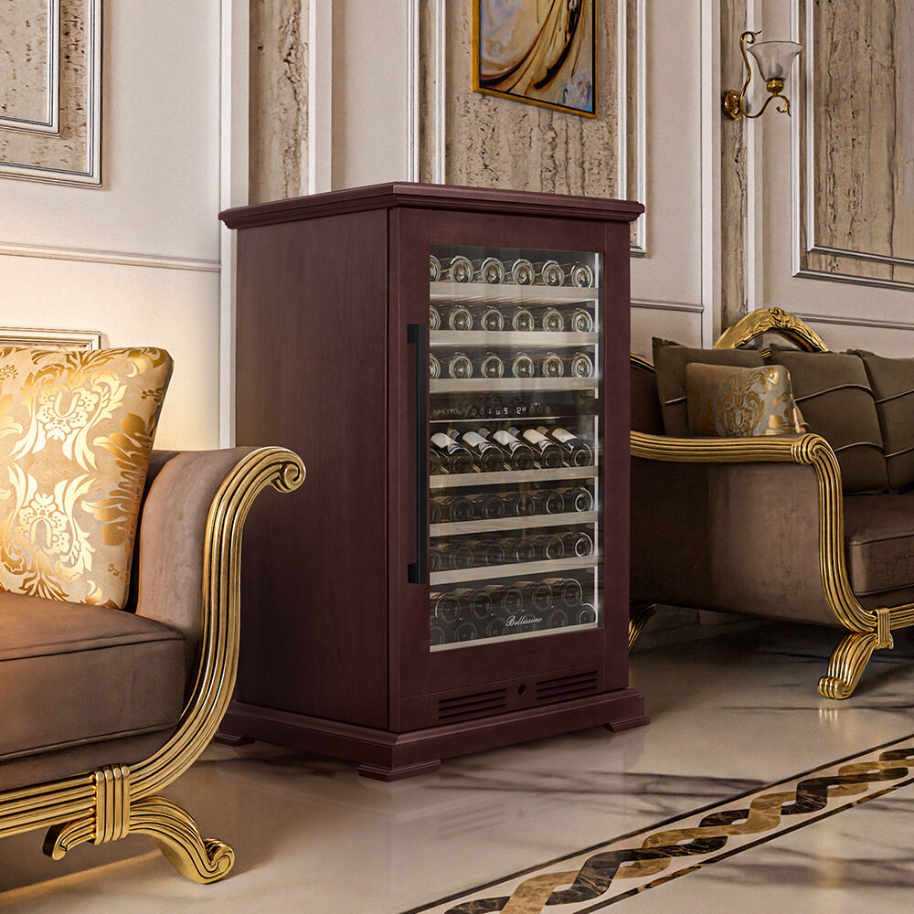 - Эксклюзивная отделка массивом бука цвета «спелая вишня» – стальной корпус обшит натуральным деревом насыщенного темно-красного оттенка, что придает шкафу роскошный, статусный внешний вид. Такая отделка превращает технику в элегантный предмет интерьера, обогащающий классические, винтажные или современные пространства.