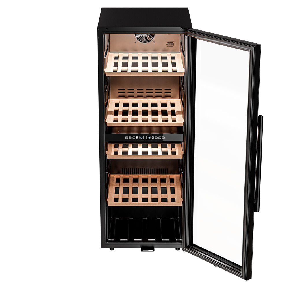 - Вместимость профессионального уровня – полезный объём 198 литров позволяет разместить до 98 стандартных бутылок Бордо (0,75 л) с возможностью установки дополнительных полок (до 5 опционально) и размещения крупноформатных бутылок или бутылок в вертикальном положении.