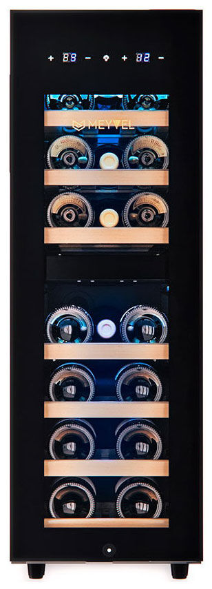 Винный шкаф Meyvel MV98-KBF2 – профессиональный двухзональный шкаф на 98 бутылок с компрессорным охлаждением и выдвижными полками