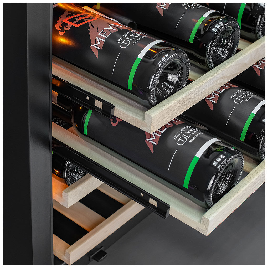 - Эффективная организация на выкатных полках – 6 полок, включая выкатные и мини-полки из массива бука, обеспечивают удобный доступ и компактное хранение до 46 стандартных бутылок. Деревянные полки эффективно гасят вибрации.