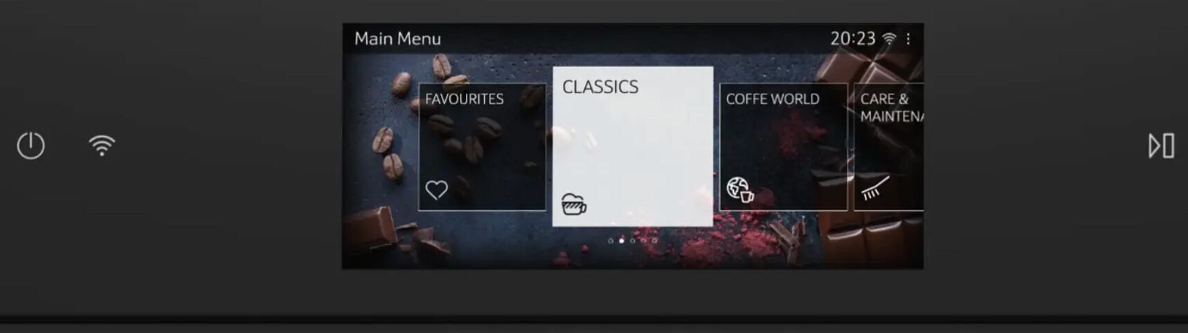 - Широчайший выбор напитков одним касанием – меню включает ристретто, эспрессо, эспрессо макиато, классический кофе, капучино, латте макиато, кафе латте, кофе с молоком, молочную пенку, теплое молоко и горячую воду.