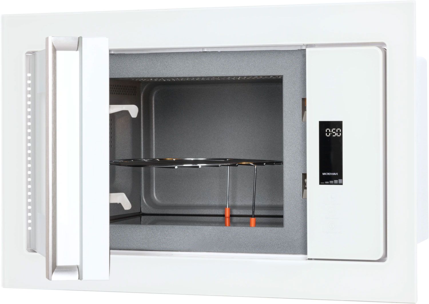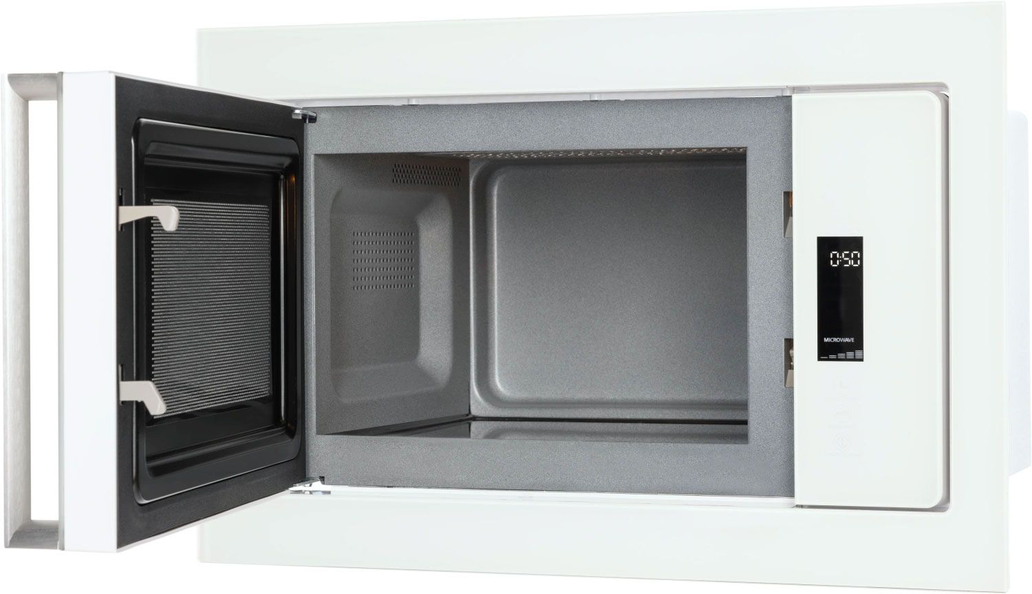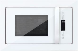 - Стильная и компактная встройка — фасад из белого стекла и оптимальные габариты для интеграции в кухонный гарнитур