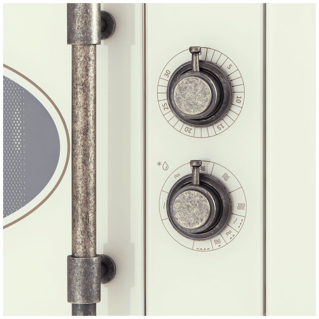 Встраиваемая микроволновая печь Maunfeld JBMO.20.5GRIB в цвете «слоновая кость» с отделкой под состаренную бронзу привносит ноты винтажной элегантности в современную кухню. Модель сочетает классический дизайн, функцию гриля и отсутствие поворотного стола, предлагая практичность и эстетику в одном решении.