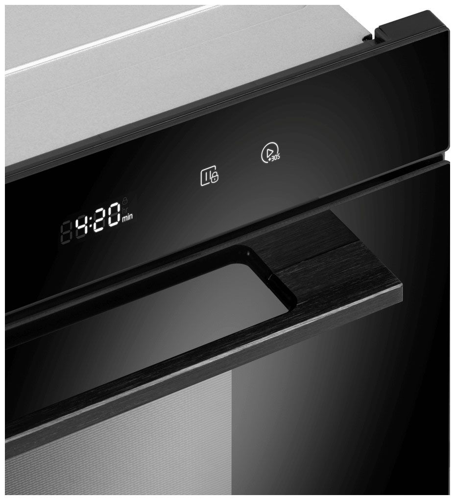 - Полностью сенсорное управление с дисплеем — современная интуитивная панель обеспечивает точную настройку 5 режимов мощности, 8 программ автоприготовления, разморозки по весу/времени. Открытие дверцы также сенсорное.
