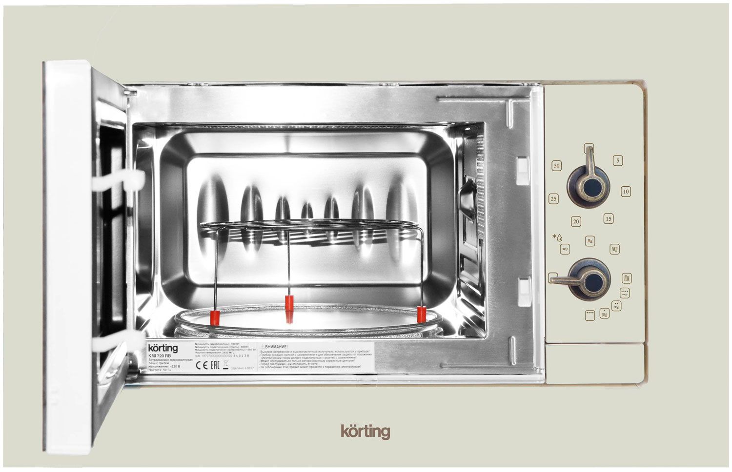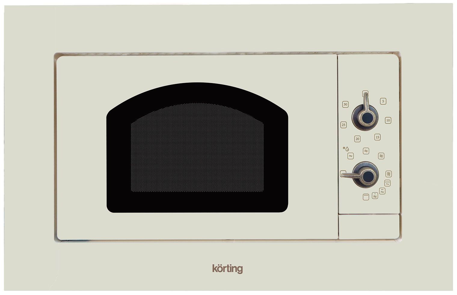 Встраиваемая микроволновая печь Korting KMI 720 RB в цвете «слоновая кость» с бронзовыми акцентами сочетает уникальный ретро-дизайн коллекции Classico и проверенную многофункциональность. Модель идеально интегрируется в кухонный гарнитур, экономя пространство, и дополняет комплекты техники в едином стиле.