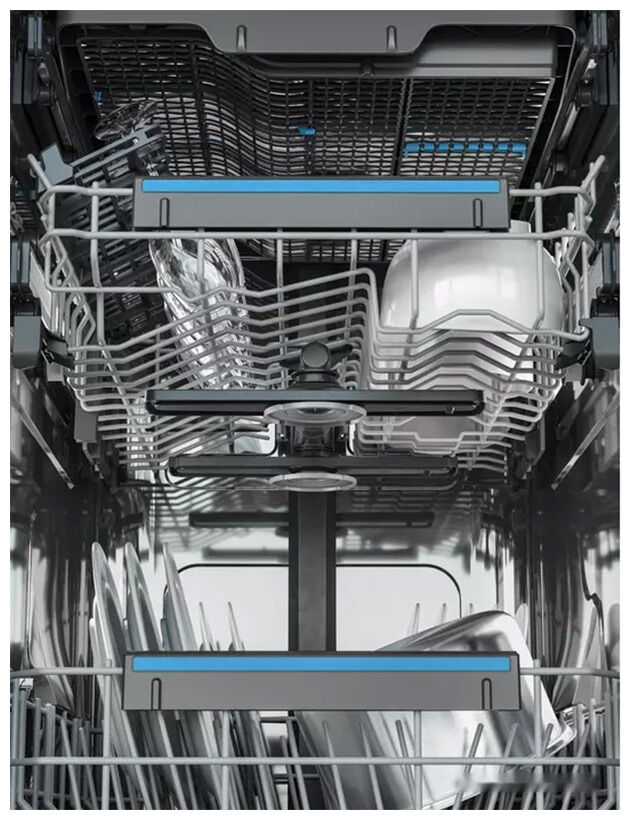 - Премиальная организация внутреннего пространства – верхняя корзина FlexiLift регулируется по высоте даже при полной загрузке, держатели SoftSpikes и SoftGrip бережно фиксируют чашки и бокалы, лоток MaxiFlex вмещает столовые приборы любой формы, а 4 складных держателя в нижней корзине облегчают загрузку крупной посуды.