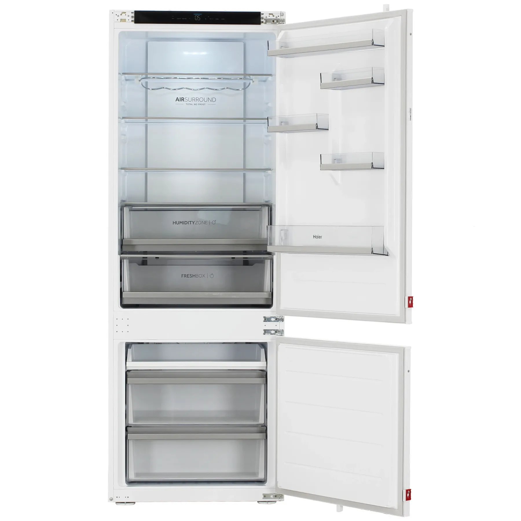Встраиваемый холодильник Haier HBCN7190U1 – это просторное решение для большой семьи с увеличенной шириной 70 см и общим полезным объемом 369 литров (282 л холодильная + 87 л морозильная камера). Инверторный компрессор обеспечивает низкий уровень шума 33 дБ и класс энергоэффективности A+. Технология AirSurround для равномерной циркуляции воздуха, складная двойная винная полка, зона свежести Humidity Zone и Wi-Fi управление через приложение evo делают эту модель идеальным выбором для требовательных пользователей.
