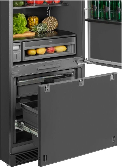 - Жесткое крепление фасадов (Door-on-Door) — мебельные фасады крепятся напрямую к дверям холодильника, создавая безупречно ровную линию без зазоров и выступающих элементов.