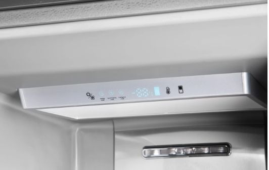 - Жесткое крепление фасадов (Door-on-Door) — система позволяет монтировать мебельный фасад напрямую к двери морозильника, создавая безупречно ровную линию с кухонным гарнитуром.