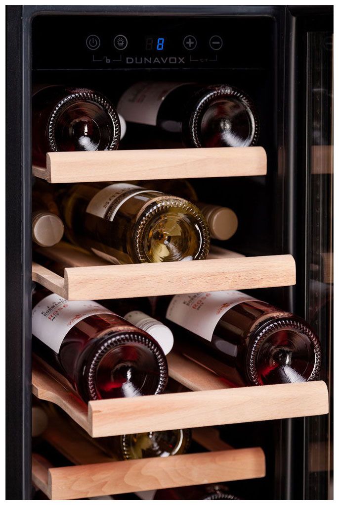 Встраиваемый винный шкаф Dunavox DAUF-19.58B в элегантном черном цвете сочетает компактные размеры и современные технологии для создания идеальных условий хранения вина. Модель оснащена двойной стеклянной дверцей, сенсорным управлением и деревянными полками из натурального бука.