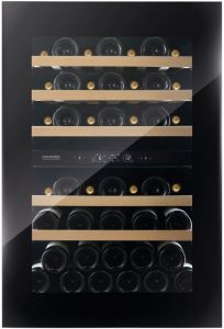 - Двухзонное климатическое регулирование — независимые температурные зоны для одновременного хранения разных типов вин. Верхняя зона: +5°C до +10°C, нижняя: +10°C до +18°C