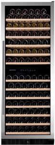 Профессиональная вместимость и премиальное исполнение – 13 выдвижных полок из массива бука обеспечивают надежное хранение 108 бутылок стандарта «Бордо», включая нестандартные форматы. Дверь из нержавеющей стали добавляет солидности и стиля.