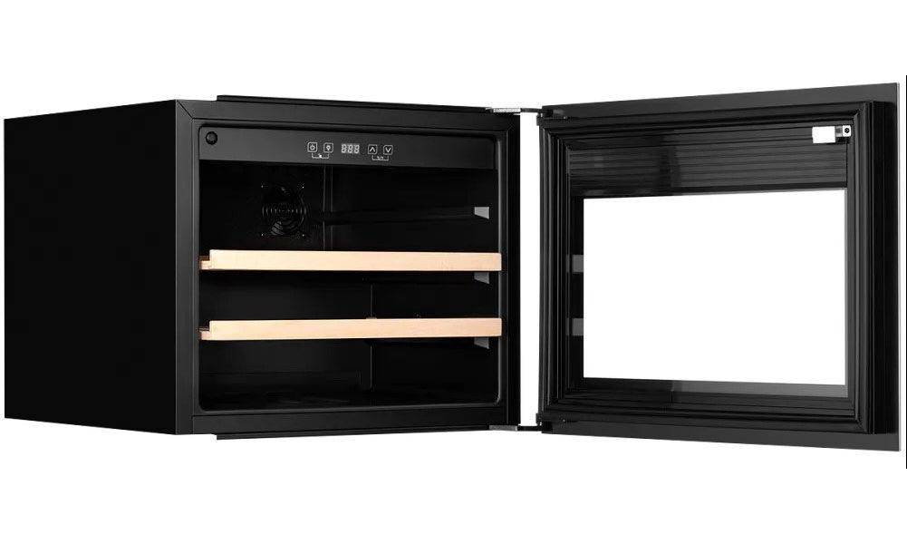 Оптимальная вместимость в компактном корпусе – Объем 62 литра и 2 деревянные полки вмещают до 28 бутылок стандарта «Бордо**. Стекло с УФ-фильтром защищает вина от света. Светодиодная подсветка обеспечивает видимость.