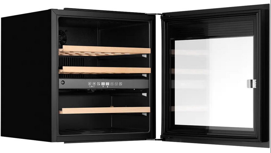 - Компактные габариты для встраивания — оптимальный размер для интеграции в кухонную мебель или барную зону. Объем 85 литров для 36 бутылок стандартного размера.