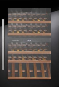 - Две независимые климатические зоны — раздельное регулирование температуры в верхнем и нижнем отделениях (от 5°C до 18°C). Позволяет одновременно хранить белые, красные, игристые вина и крепкие напитки при их оптимальной температуре.