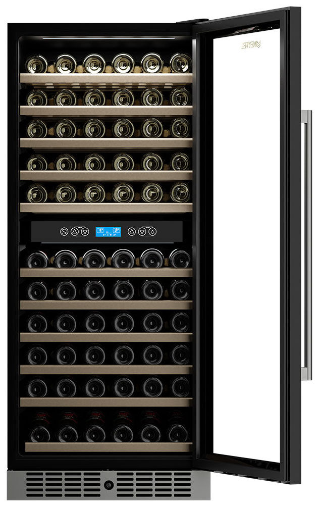 - Вместительность и адаптивность для коллекции – 11 выдвижных полок из массива бука обеспечивают удобный доступ и хранение до 116 стандартных бутылок. Две полки с увеличенным пространством предназначены для бутылок нестандартного формата. Вместительный объём 322 литра рассчитан на сформированную коллекцию.