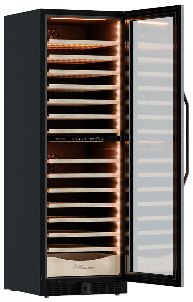 - Профессиональный двухзонный климат-контроль высшего уровня – внутреннее пространство разделено на две независимые климатические зоны (верхняя: +5°C…+12°C, нижняя: +12°C…+20°C), каждая с широким диапазоном настройки. Это позволяет создавать идеальные и различные условия для одновременной выдержки игристых, белых, красных и креплёных вин. Поддерживается влажность 60-80%.