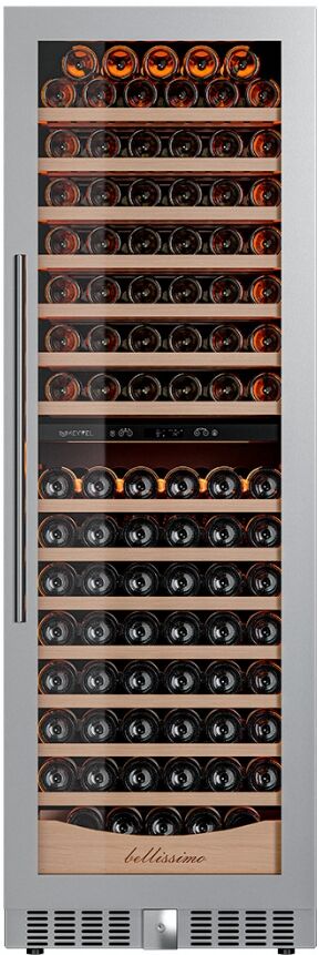 - Максимальная на рынке вместимость для встраивания – полезный объём 425 литров позволяет разместить до 174 бутылок стандарта Бордо, что соответствует фонду солидного ресторана или частной коллекции мечты. 14 выкатных полок из массива бука и отдельный выдвижной ящик внизу обеспечивают безупречную организацию, включая хранение бутылок Magnum и аксессуаров.