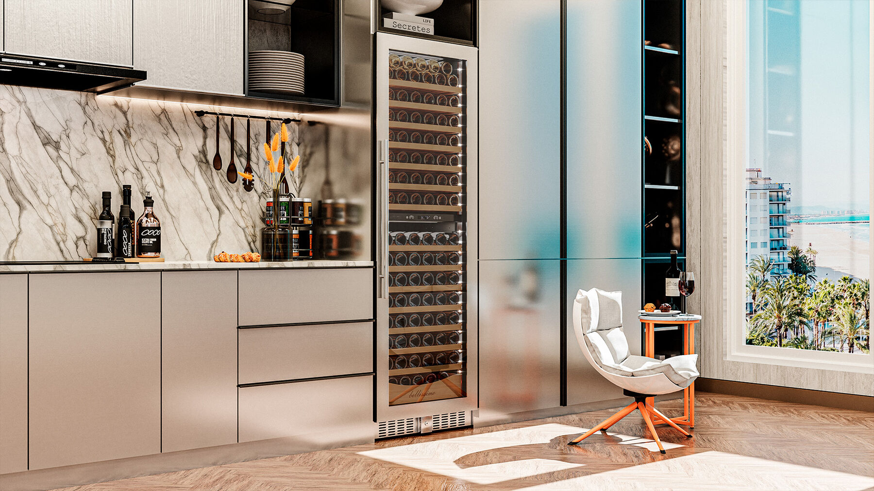 - Готовность к масштабированию – функция Side by Side позволяет установить два таких шкафа рядом, получив винную стену вместимостью почти 350 бутылок с безупречно выверенным внешним видом – мечту любого ресторатора или коллекционера.