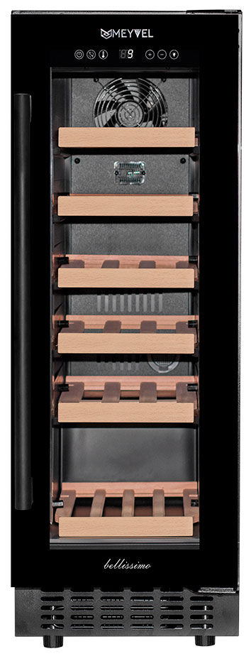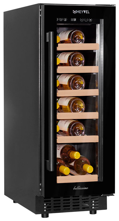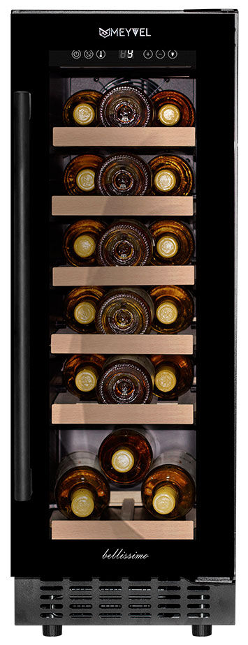 Встраиваемый винный шкаф Meyvel MV19-KBT1 – узкий климатический шкаф с тройным стеклом и панорамной подсветкой на 19 бутылок