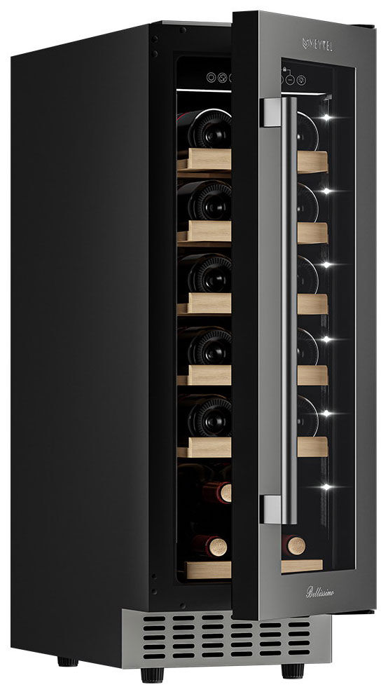 - Премиальный дизайн и отделка – ключевая особенность модели – рамка двери из бесшовной нержавеющей стали, которая придаёт шкафу дорогой, целостный вид и легко сочетается с современной бытовой техникой. Тройное стекло с УФ-фильтром защищает вина от вредного излучения.