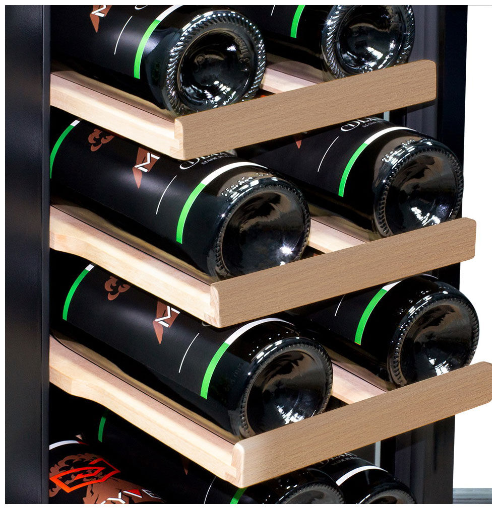 - Вместительность в узком корпусе – несмотря на скромную ширину 29.5 см, продуманная компоновка с 6 выдвижными полками из массива бука позволяет разместить до 19 стандартных бутылок (объём 58 л), что идеально для встройки в узкие ниши или торцы кухонных гарнитуров.