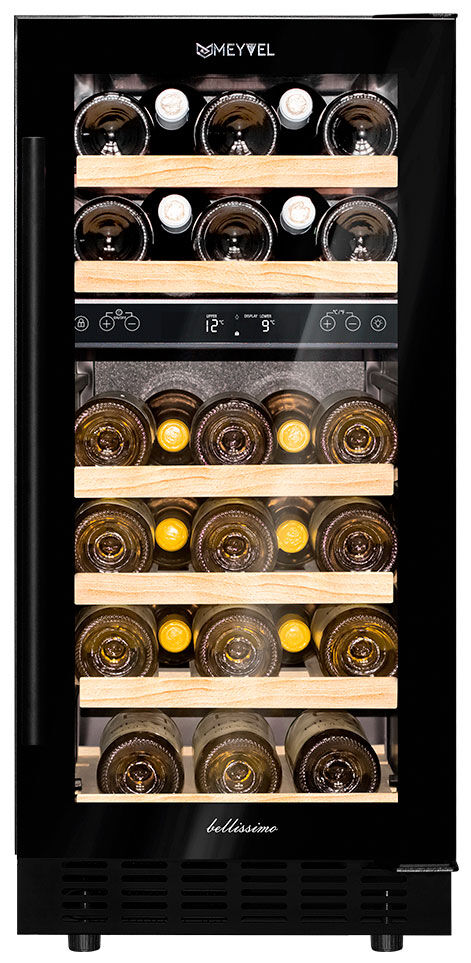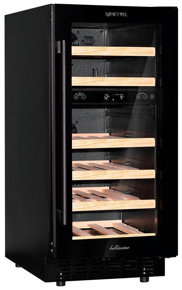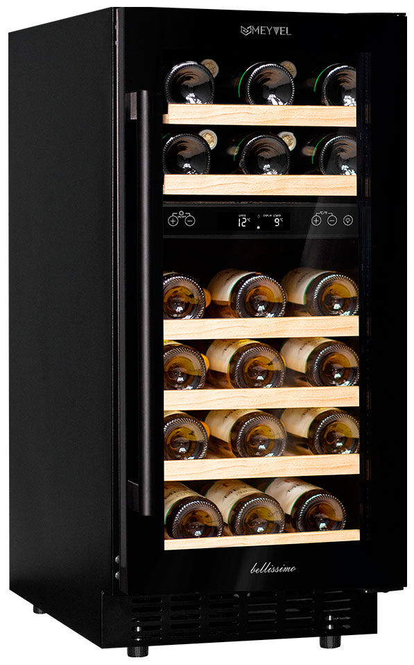 Встраиваемый винный шкаф Meyvel MV28-KBT2 – двухзональный шкаф с панорамной подсветкой на 28 бутылок для встраивания под столешницу
