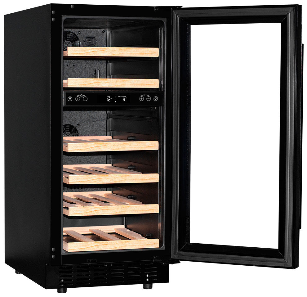 - Оптимальная вместимость для встраивания – при ширине всего 38 см шкаф вмещает до 28 стандартных бутылок (объём 85 л), что является максимальной ёмкостью в данном форм-факторе, идеально подходящем для встраивания в стандартную кухонную колонну.