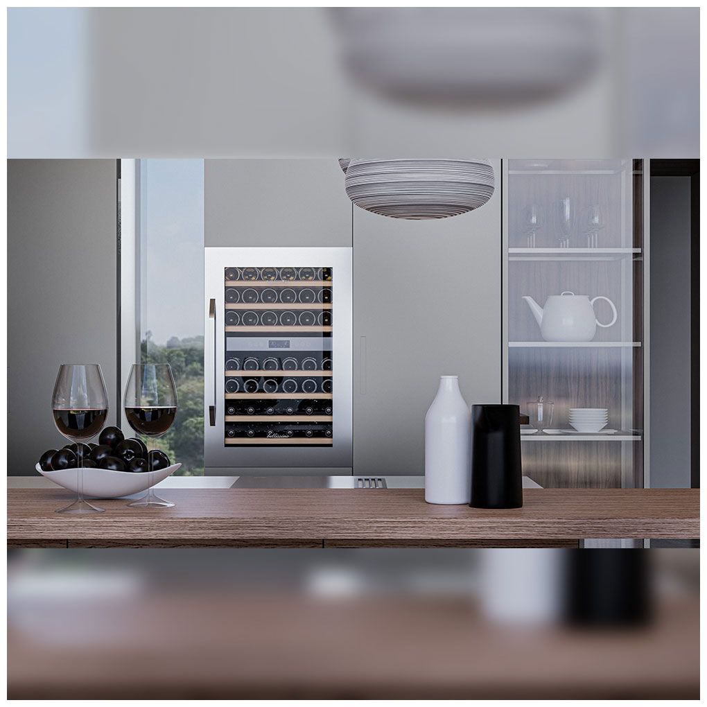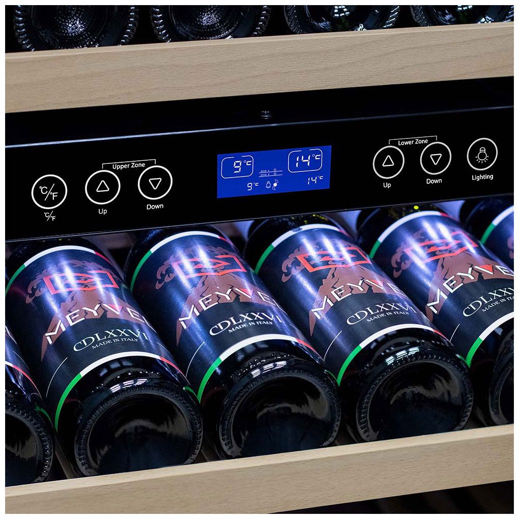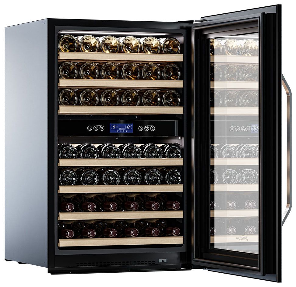 - Две независимые климатические зоны – возможность одновременно хранить красные, белые и игристые вина при разных температурах: верхняя зона +5°C...+10°C, нижняя зона +10°C...+18°C