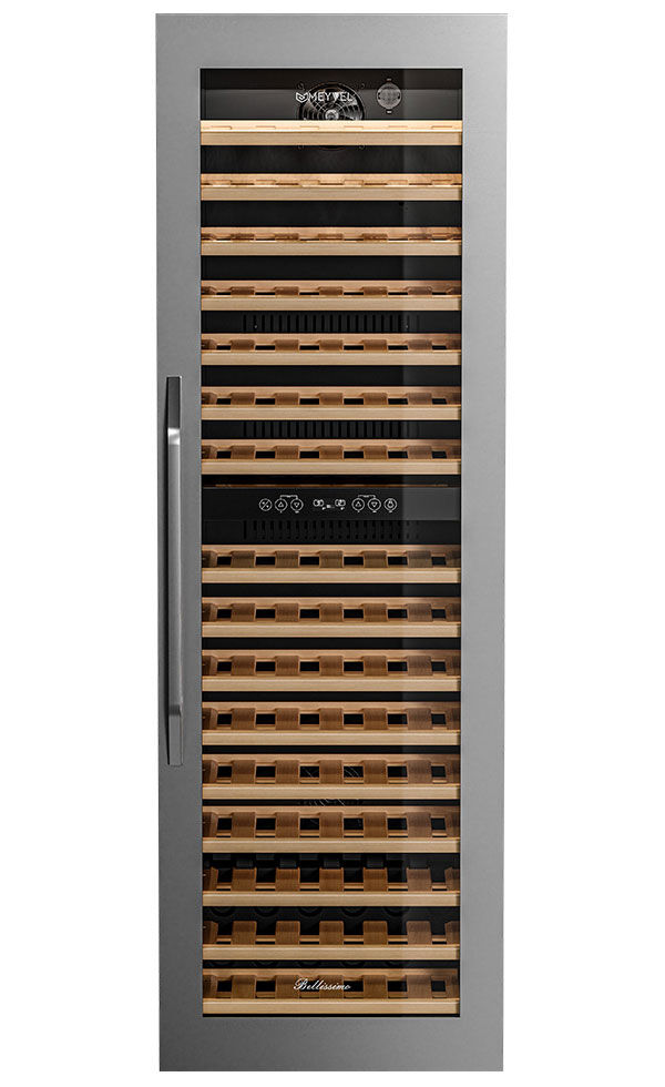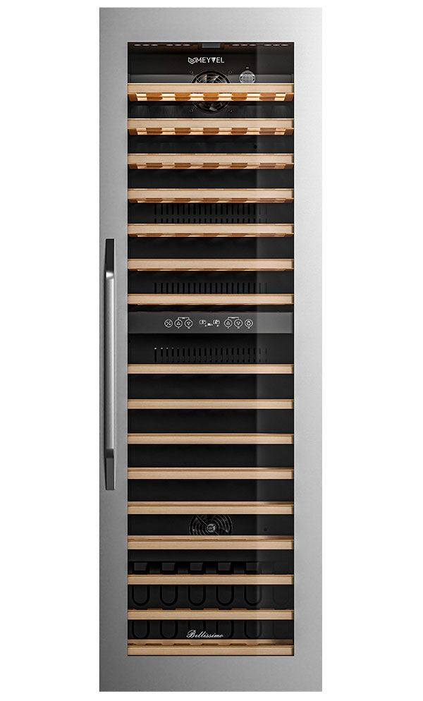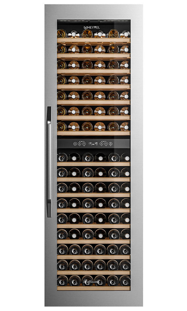 Встраиваемый винный шкаф Meyvel MV83-KSB2 – двухзонная высококолонна для 96 бутылок в стальном исполнении